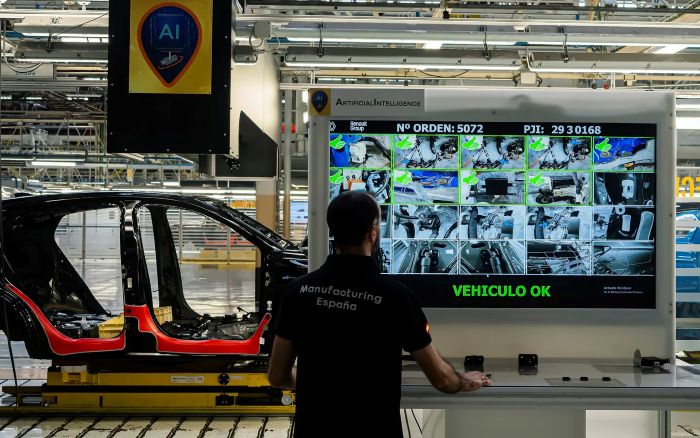 Contrôle qualité sur une chaîne de production en Espagne. 500 à 600 photos sont prises à différentes étapes et vérifiées par des algorithmes d'IA. (Photo : Renault)
