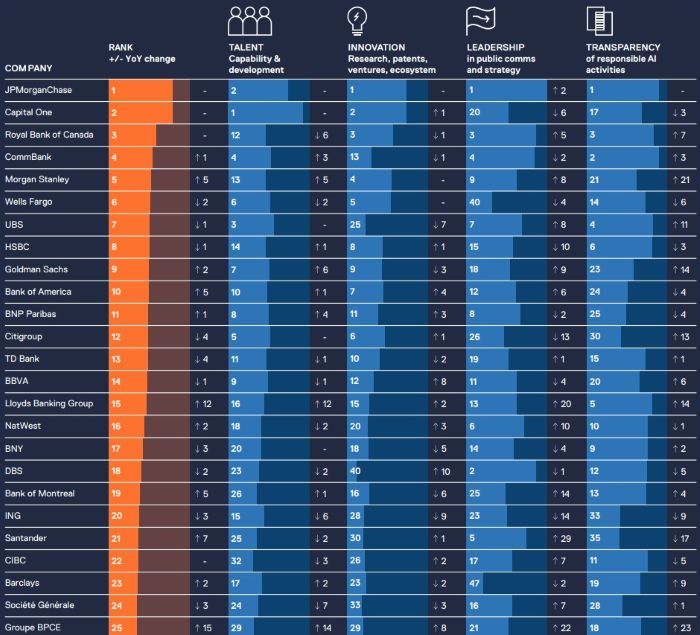 Juste derrière ces leaders, BNP Paribas occupe la 11ème place de ce classement, soit un gain d'une position en un an, notamment grâce aux compétences que réunit le premier établissement français. Depuis 2023, la banque se classe aux alentours de cette dixième position. Ce qui souligne la continuité de ses investissements sur le sujet, car le niveau global s'élève. Les 25 premières banques ont vu leur score progresser en moyenne de 5,8 points depuis l'an dernier au classement du cabinet britannique, qui évalue la maturité en IA des banques sur la base de données publiques réparties sur quatre critères (compétences, innovation, leadership et transparence, pour donner une note sur 100).