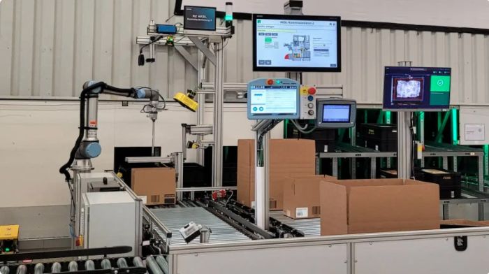 Préparation de commandes robotisée assistée par l'IA dans la partie logistique de l'usine d'Erlangen. (Crédit : Jürgen Hill)