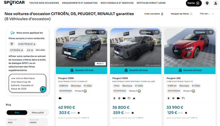 Outre WhatsApp, Spoticar a aussi déployé sa propre IA sur le Web, basée sur GPT-5. Aujourd'hui disponible en France, elle doit être étendue à d'autres pays d'Europe début mars. Les utilisateurs peuvent rentrer en langage naturel leurs envies et l'IA se charge ensuite de proposer les résultats attendus. Si l'intention est bonne, un petit test effectué en ligne montre toutefois qu'il y a encore des réglages à faire.