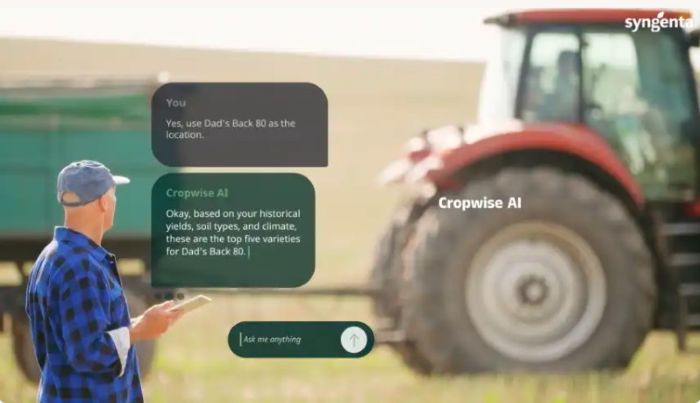 Syngenta, qui a réalisé 28,8 Md$ de chiffre d'affaires en 2024, encourage également l'utilisation des technologies numériques par les agriculteurs, notamment avec la plateforme Cropwise. Celle-ci utilise l'intelligence artificielle (Cropwise AI) et le Machine Learning pour fournir aux agriculteurs des recommandations personnalisées en langage naturel. Par exemple, des prévisions de croissance des plantes, le potentiel de rendement ou encore les facteurs de risque. De plus, le système propose des recommandations d'actions, comme les semences à privilégier pour chaque type de culture ou les moyens d'atteindre les objectifs de durabilité. Ces recommandations s'appuient sur l'analyse en temps réel et des données historiques.