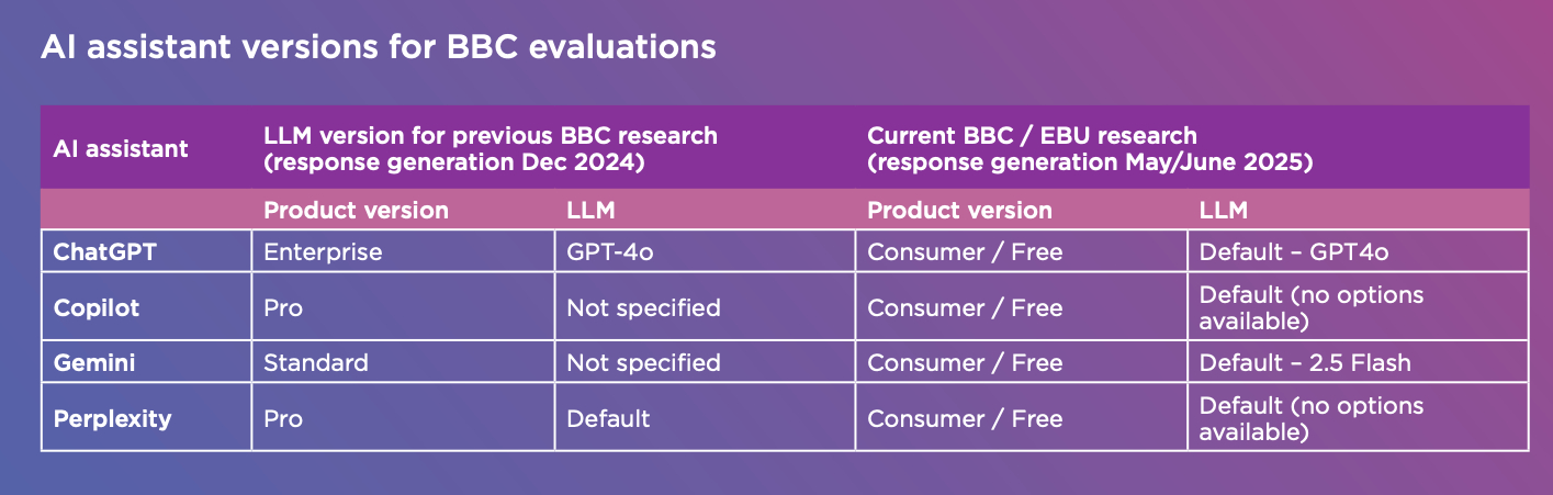 Cette étude est la deuxième menée par la BBC et UER sur les mêmes assistants de GenAI à six mois d'intervalle. Et même si, contrairement à la première, la deuxième édition porte sur plusieurs pays, plusieurs langues et plusieurs organisations, et si des différences méthodologiques et statistiques existent entre les deux, la BBC estime que la comparaison peut au moins « donner une idée de la direction générale prise par les assistants » de GenAI. Le rapport affirme ainsi que « dans l'ensemble, il y a des signes d'amélioration de la qualité des réponses [...], - la part des réponses présentant des problèmes importants de quelque nature que ce soit est passée de 51% lors du premier tour à 37% lors du tour actuel ».